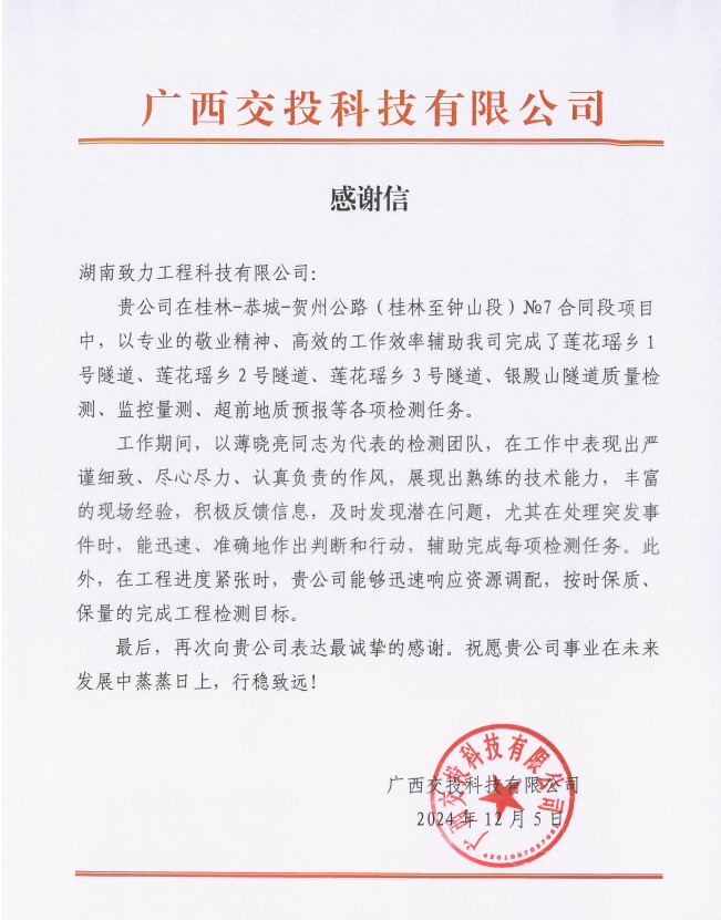 NEWS近日,湖南致力工程科技有限公司隧道檢測駐地項目部接連收到2封感謝信!信中指出,致力科技團隊專業技術精湛、經驗豐富,工作中秉持嚴謹細致、認真負責的態度,能準確且高效地完成隧道質量檢測、監控量測、超前地質預報等各類工作任務。